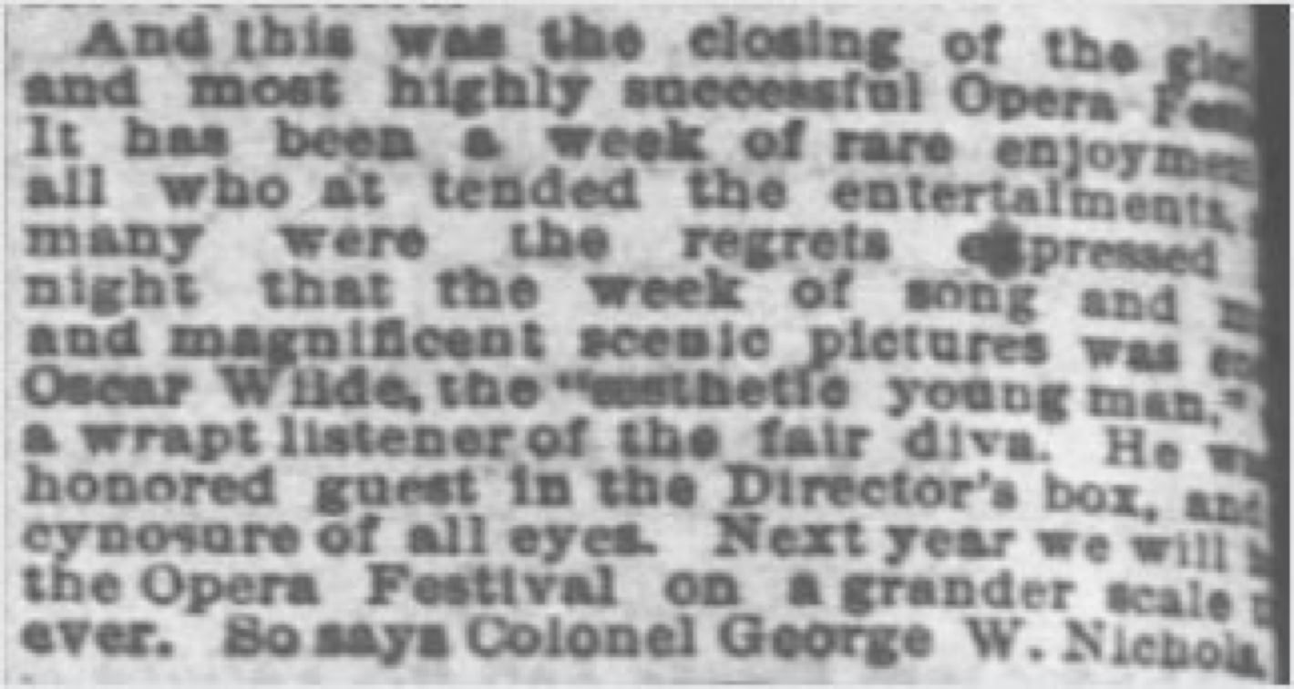 The concert that Wilde attended was a closing entertainment of selected arias by leading singers from the previous week's Cincinnati Opera Festival. Madame Patti chose "Bel Raggio" from Semiramide by Rossini.