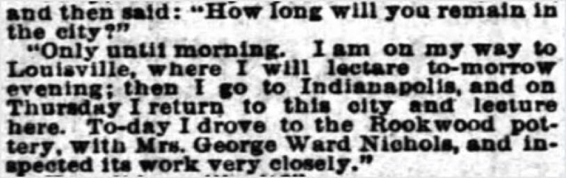 Upon arrival he checked into the Burnet House, before driving out to the famous Rookwood Pottery, where he met a talented artists he was to befriend later in New York [blog article]. Wilde returned to his hotel in the late afternoon to give an interview to The Cincinnati Enquirer. In the evening he visited the Cincinnati Music Hall to attend the opera [2] as an honored guest in the director's box.