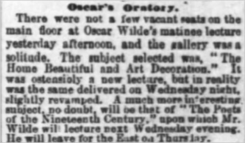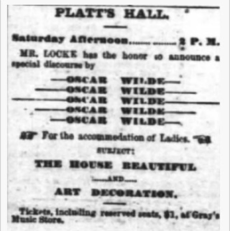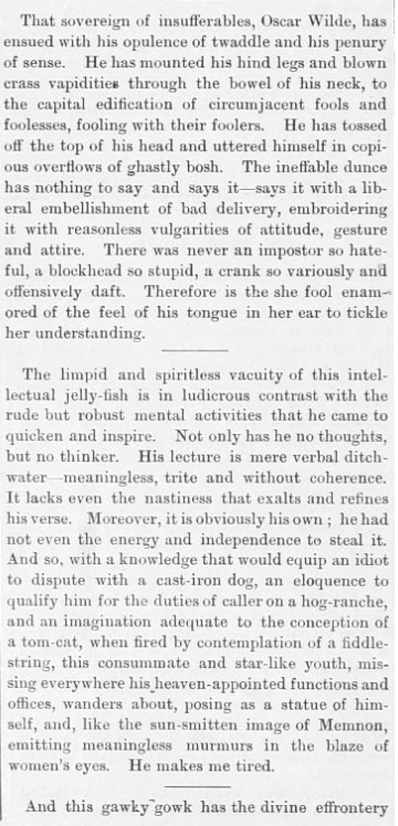Ambrose Gwinnett Bierce (1842—c. 1914) was an American editorialist, journalist, short story writer, fabulist, and satirist. The day before Wilde's lecture he published this bitter attack of Wilde in his column entitled "Prattle".