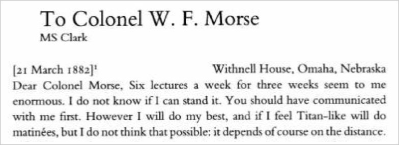 Wilde wrote from the Withnell Hotel to his manager about his tour schedule. The letter is on hotel stationery and survives at the William Andrews Clark Memorial Library, University of California, Los Angeles.