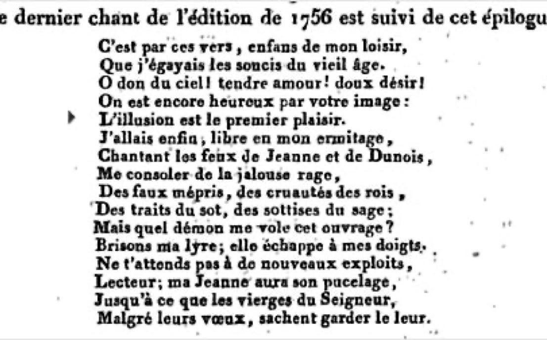 The poem was first published in 1755 but the line does not appear in that version, nor in the one authorized by M. de Voltaire in 1762. It turns up in a 1756 edition in an epilogue to a version that contains changes to many cantos that were probably made by the publisher from incomplete Voltaire manuscripts, perhaps to make the edition more profitable.