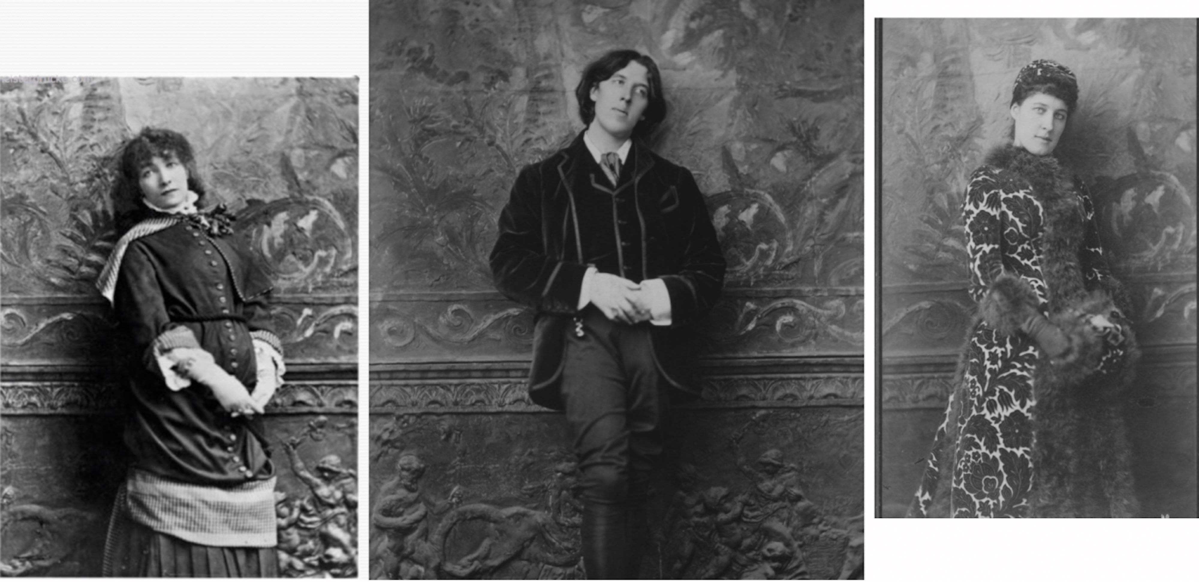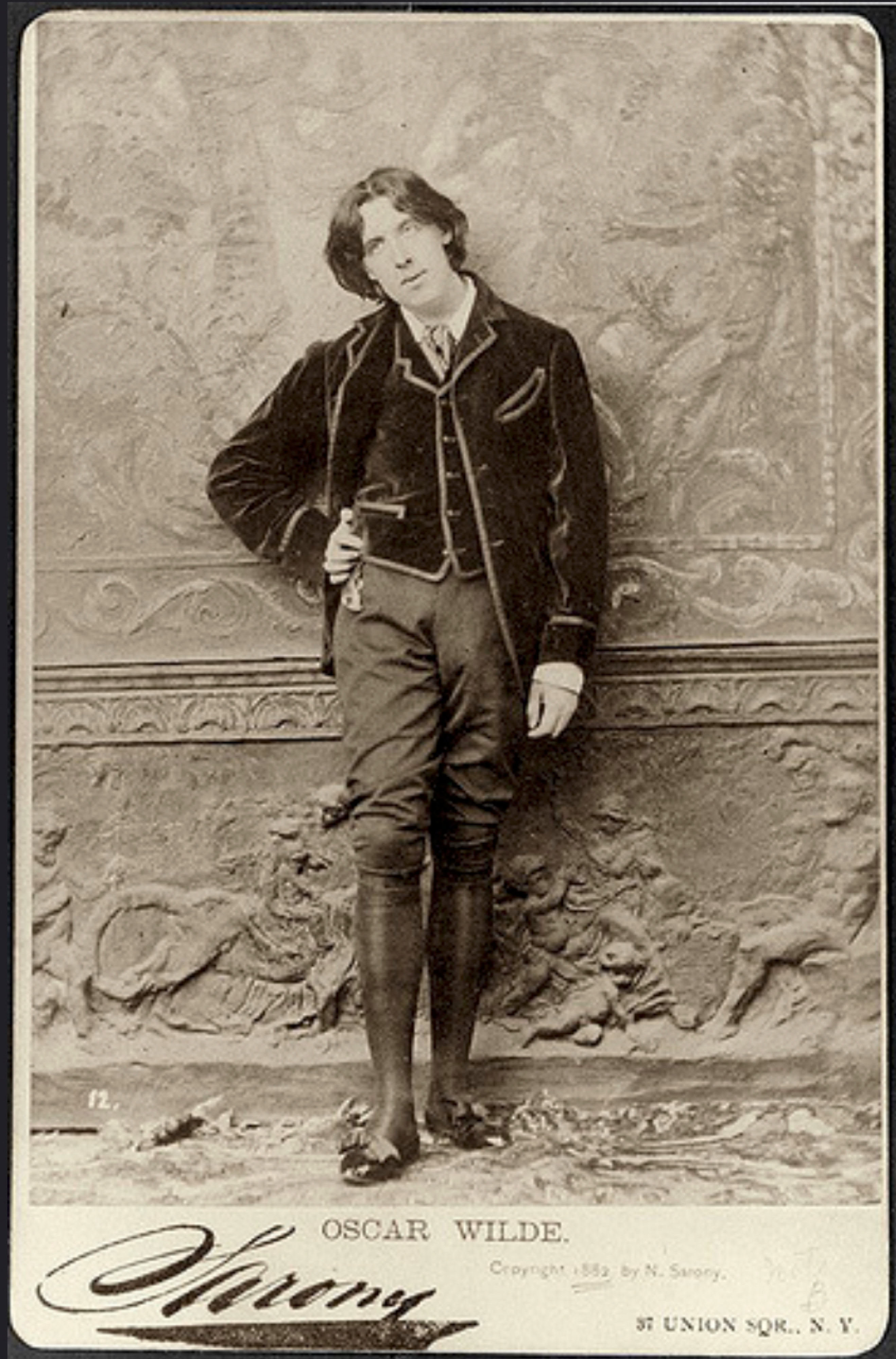 Oscar standing in exactly the same place in the Sarony’s studio in which Sarah Bernhardt had stood earlier in 1880, and Lillie Langtry later in 1882.