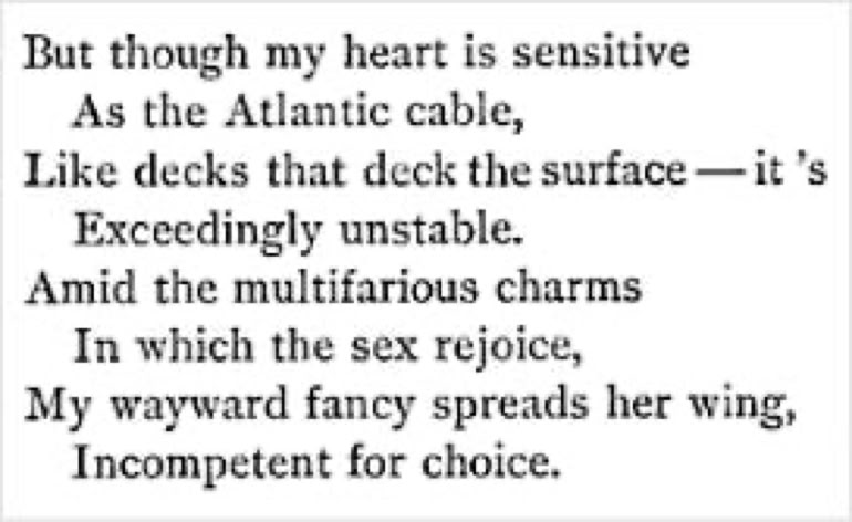 The cartoon is alternatively entitled Very Like A Wail. The closest source [2] for this phrase is a poem of the same name from The Knightly Heart, and other poems, a book of light verse by James Freeman Colman (1873). Colman's poem similarly concerns the lovelorn condition, in his case a youth faced with the fickleness of the opposite sex; the captioned lines are typical and also have a nautical theme.