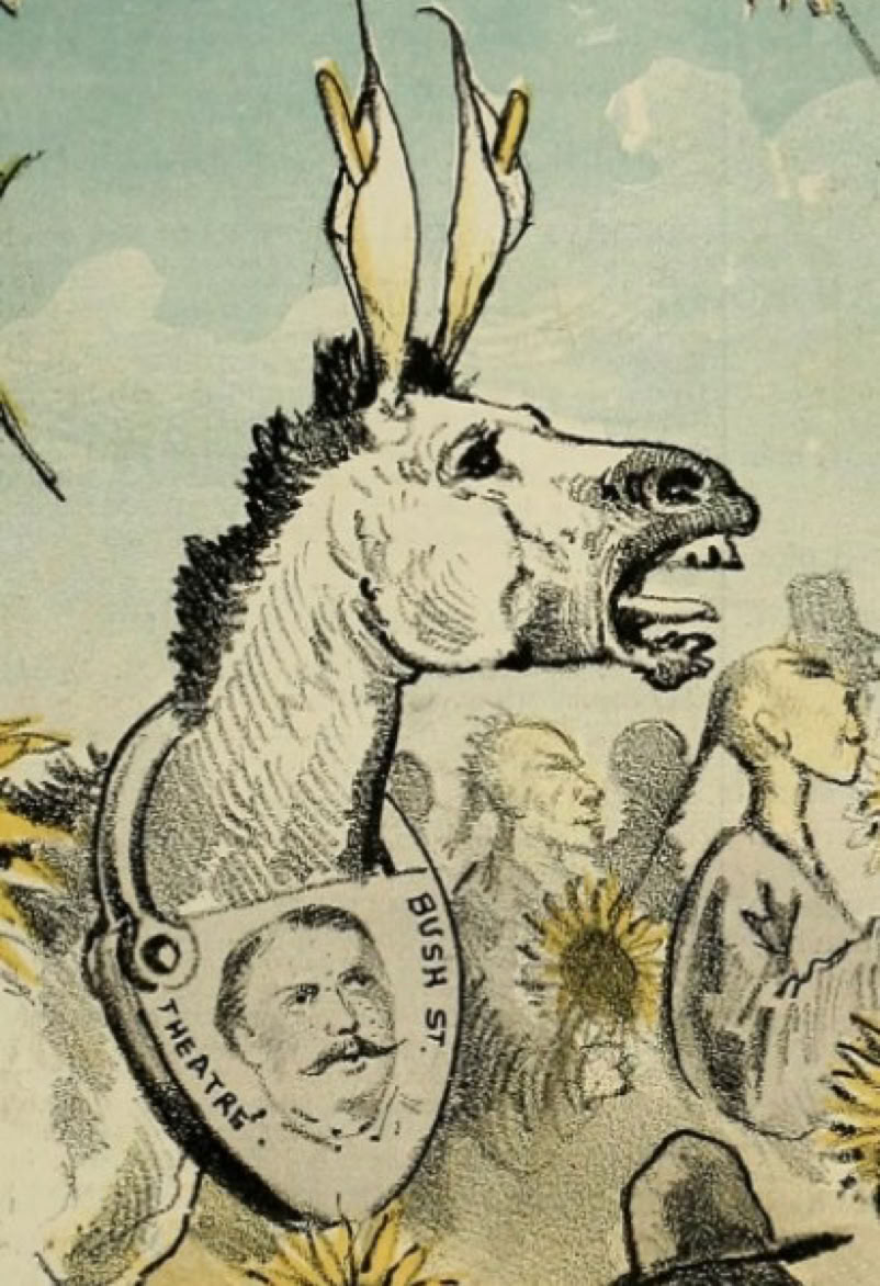 Braying, and with sunflower saddle and lily ears, we are reminded of the epithet "ass-thete" that accompanied Wilde across America, but here the donkey symbolizes his visit to San Francisco: attached to the tail is the $5,000 that Wilde was reportedly paid for his series of lectures in California; around the neck, padlocked to the conveyance, is an image of Wilde's California promoter Charles E. Locke. The words on the padlock are "Bush St. Theatre", where Locke was manager. Also, at Bush and Montgomery Streets was Platt's Hall where Wilde lectured four times.