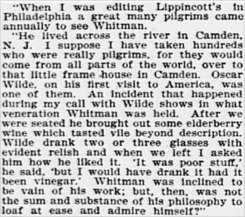 Wilde was reported to have said that the poor quality of the elderberry wine that Whitman served meant nothing to him; he would have drunk it had it been vinegar.