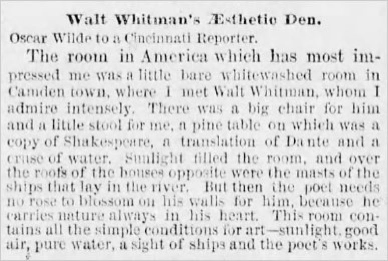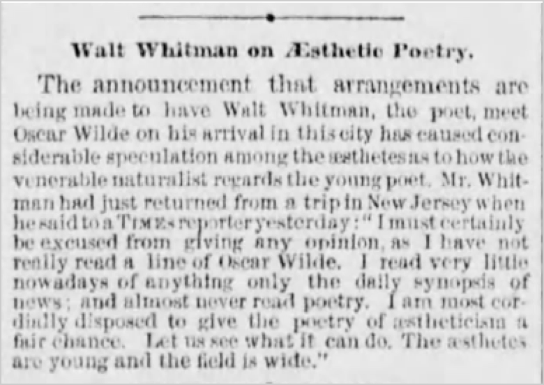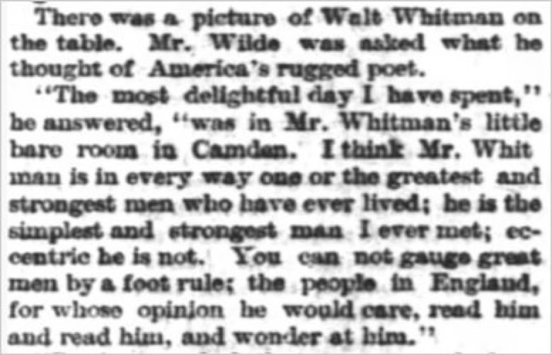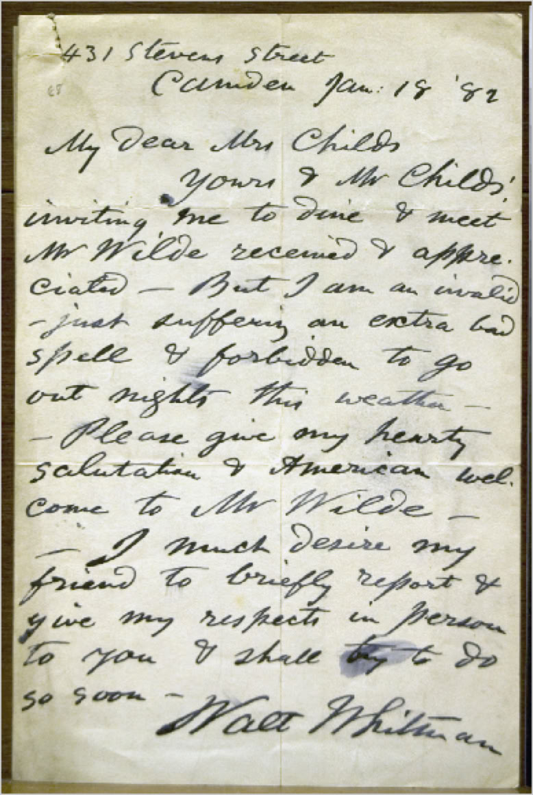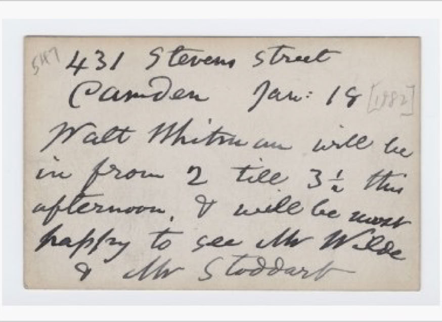 At this time Whitman was living in partial retirement at Camden, NJ, across the Delaware River from Philadelphia. As Wilde was scheduled to lecture in Philadelphia on January 17, he wasted no time in inquiring whether a meeting with Whitman could be arranged.