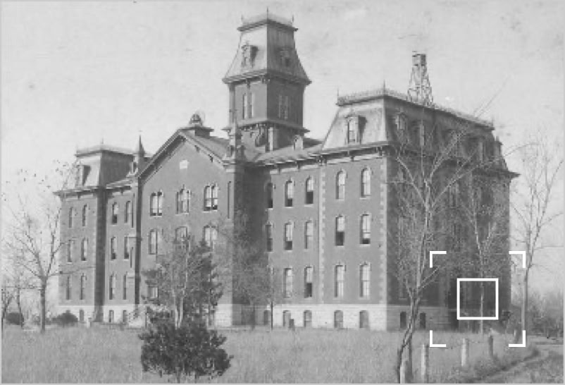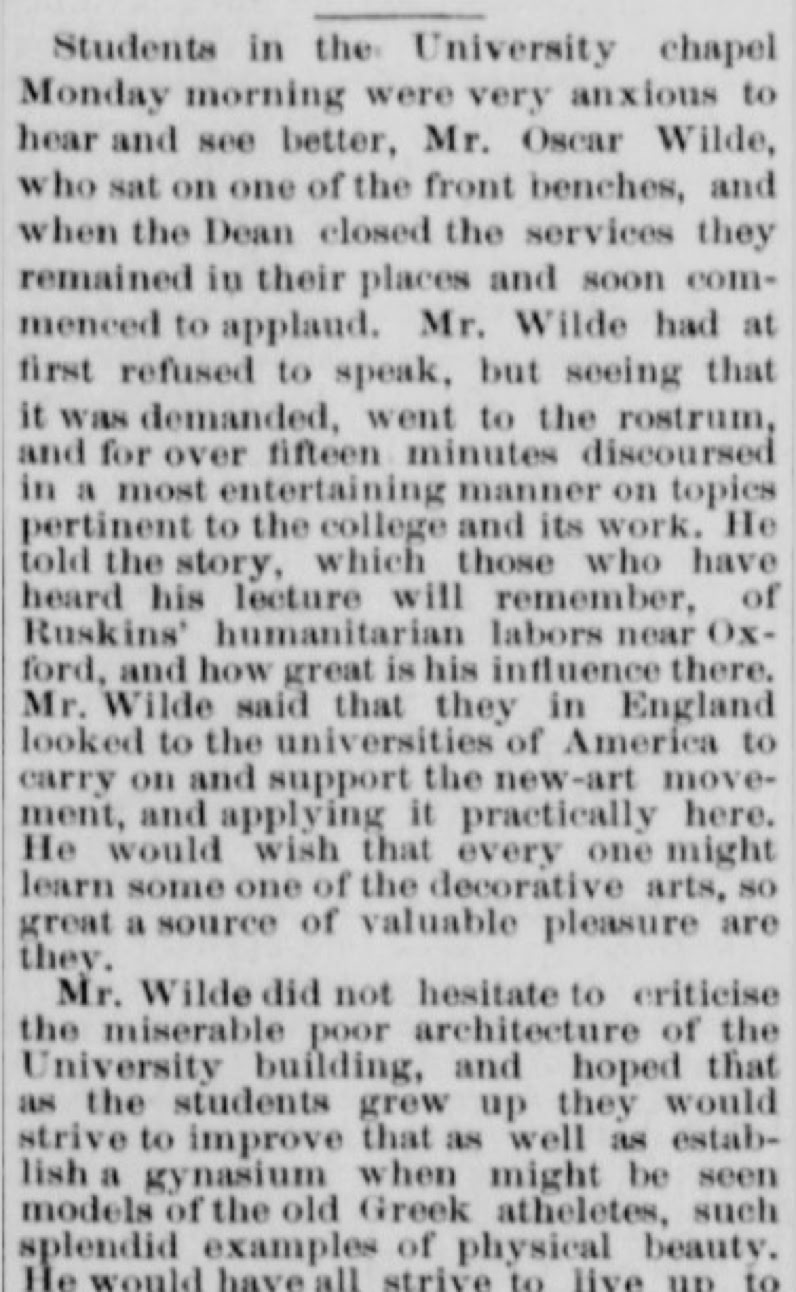Premises: At the time of Wilde's visit, University Hall was the first and then still only building of the State University. It housed administration, a recitation hall, student classes, a boys' dormitory, the library, and a chapel (where Wilde gave his address).