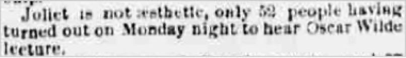 No record is currently available as to whether Wilde stayed overnight in Joliet. It is entirely possible he traveled on early by train to Jacksonville, IL, a journey of some 200 miles, where he lectured the following evening.