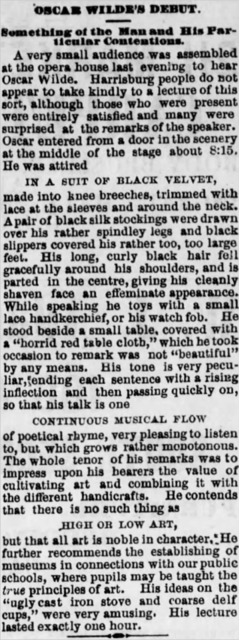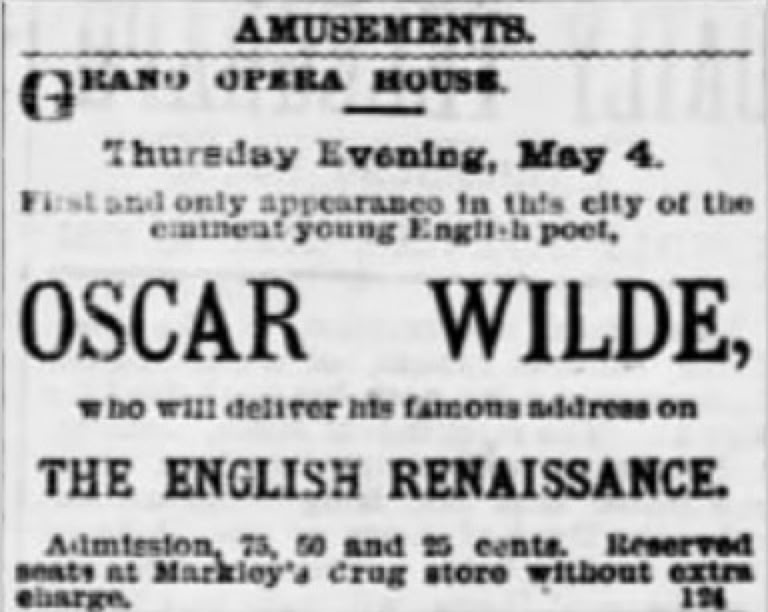 Wilde took rooms at a hotel to change and rest, something he often did even if not staying overnight, as was the case in Harrisburg. After the lecture Wilde returned to his rooms and gave an interview to the Harrisburg Telegraph before catching the 11:30 PM train to New York. (See story below under Ephemera).