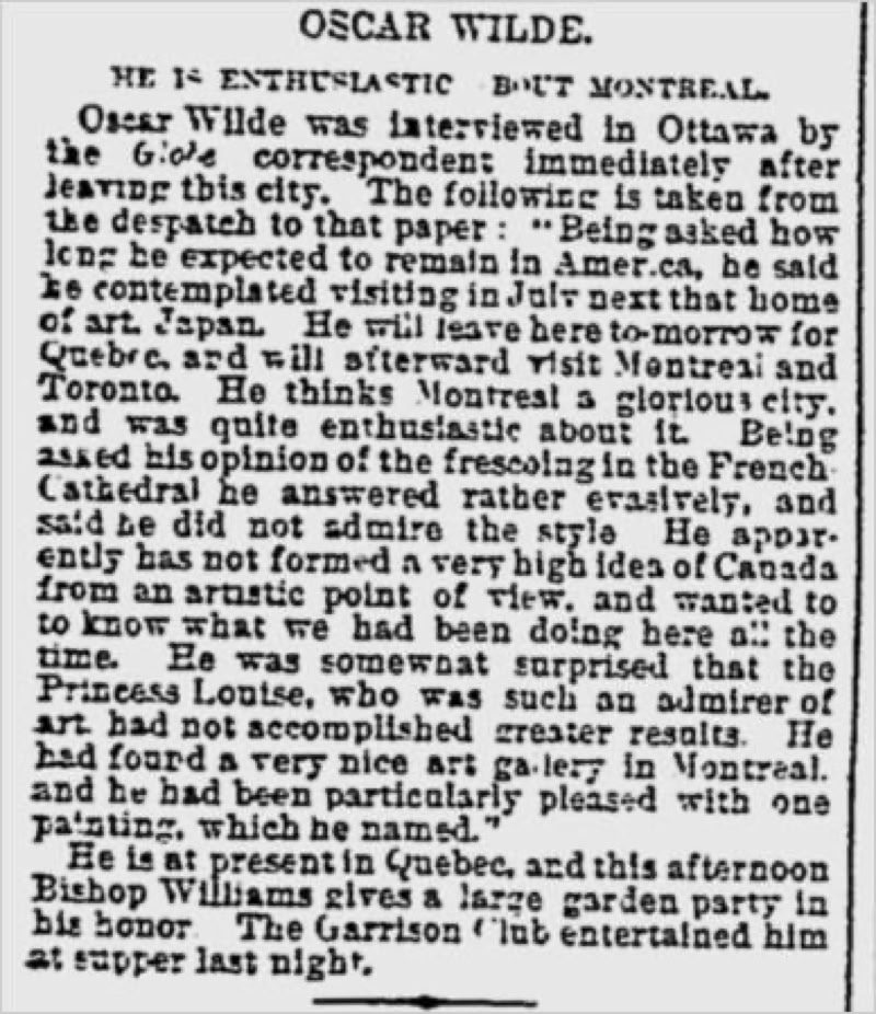 The following day Wilde departed Ottawa by the 4.55 pm train to Quebec City.