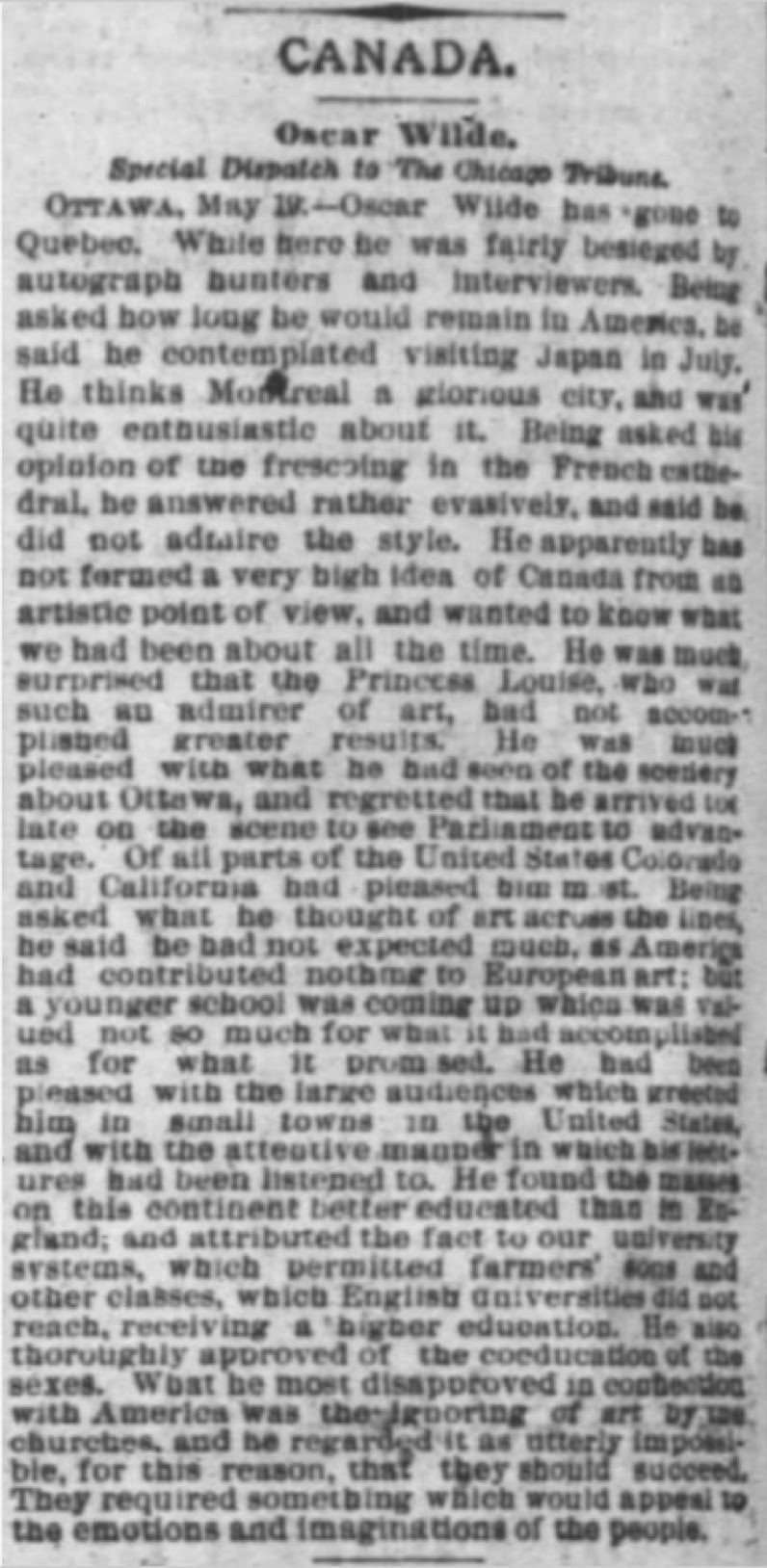 Fortunately, there is Kevin O’Brien's definitive account of Oscar Wilde's lectures in Canada, which cites primary sources for most lectures. Again, however, the one in Quebec City, lacks specific verification, but O'Brien does cite the Morning Chronicle's report of the lecture without giving specifics.